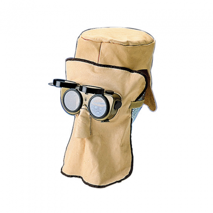 Ledermaske aus weichem Narbenleder mit Kevlar-Garn genäht, zum Schutzgasschweißen in Zwangslagen, mit Nasenaussparung und AMIGO-Brille für Gläser 50 mm. Durch die zusätzliche Lederhaube eignet sich die Ledermaske besonders für Überkopfschweißarbeiten.